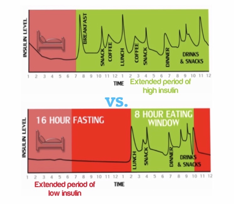 The red window represents fasting time, where insulin levels are really low. During this time, the opposite hormone of insulin, called glucagon, is used to pull sugar back out of storage so they can be used for energy. This system is underdeveloped in most people since their body is so used to always having insulin present. Through intermittent fasting, we can train our body release less insulin and lower our insulin resistance.